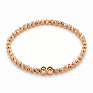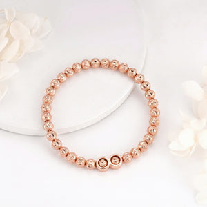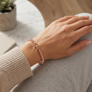 This bracelet features polished rose-tone beads strung on a stretchable band, offering a seamless fit with no clasp needed.